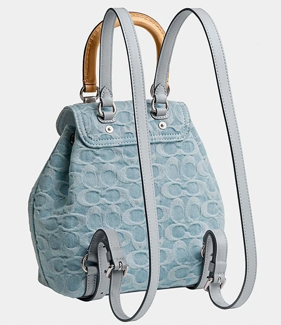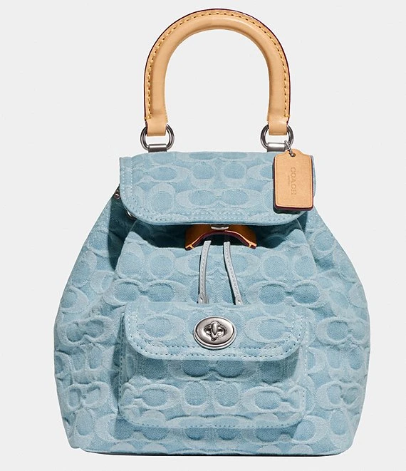 Finished with our Rogue luggage top handle and Signature turn-lock closure, it’s crafted of our laid-back light-wash Signature denim with glove-tanned leather details and features a convenient exterior pocket for easy access to essentials. The interior drawstring and snap closure keep belongings secure, while adjustable shoulder straps ensure comfortable, all-day wear.Â