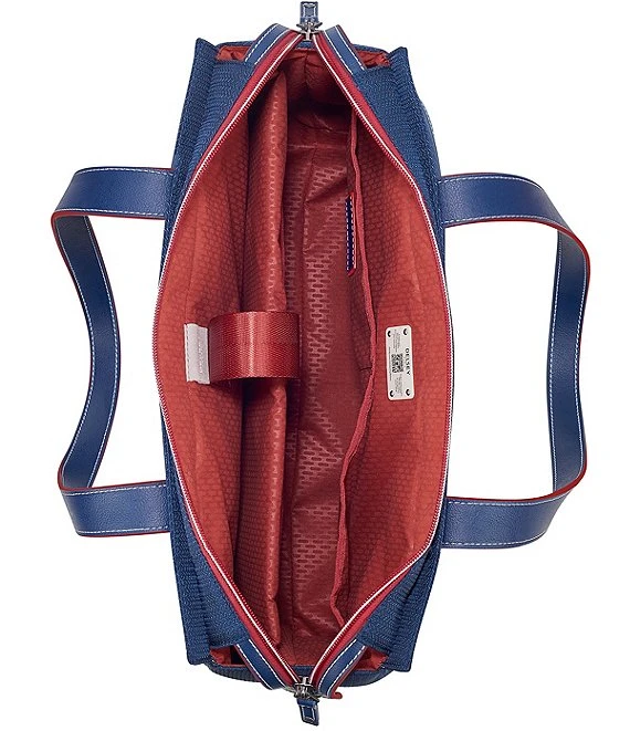 - Vegan-leather trims and the deluxe soft-touch interior are the perfect accents to this stylish tote