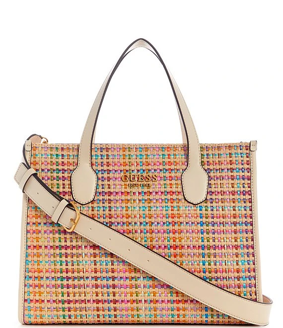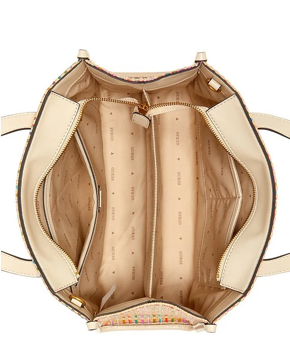 From Guess, the Silvana Multicolor Woven Straw Two Compartment Tote Bag features: