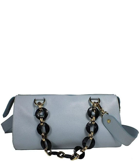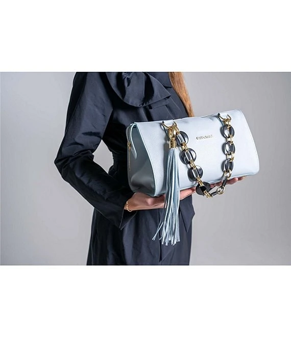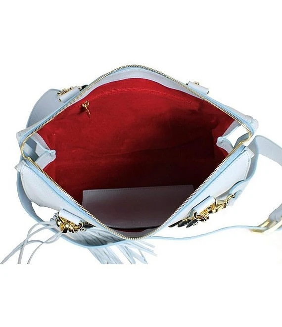 This bag is a Rock Star! Slightly smaller than the original, you will find the size to be a perfect satchel for everyone. The bold red chain handles makes this a truly fabulous satchel bag. The gorgeous top zipper extends the full length of the bag allowing the gold hardware to pop! The red suede-lined interior is surprisingly roomy. You want this adorable bag!