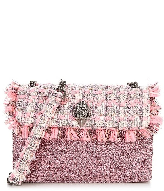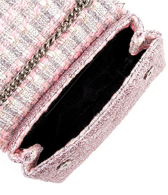 - Tweed exterior with fringed edge – branded slash and card pocket