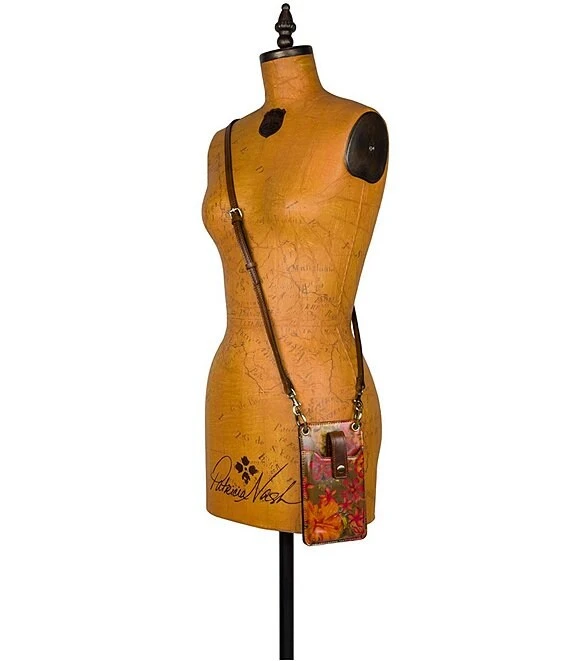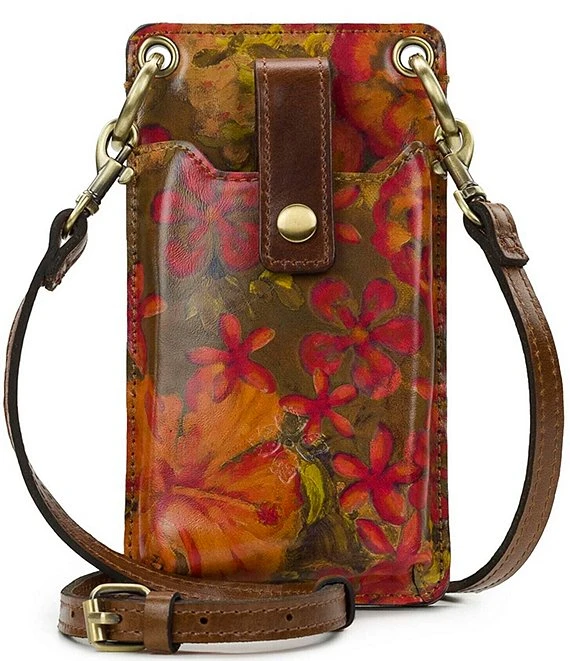 - Exterior: Front phone pouch with snap closure, 1 rear zip pocket, deep embossed grape leaf logo, quick release rings, burned edge finish