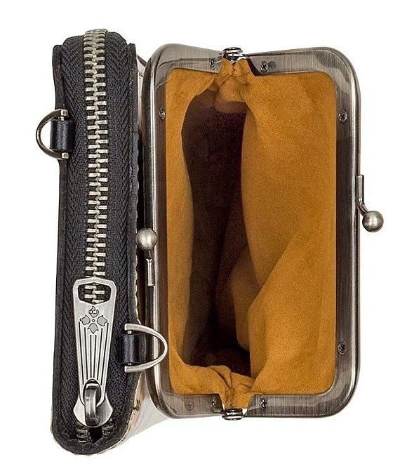 - Exterior: 1 rear kiss-lock pocket, burned edge finish